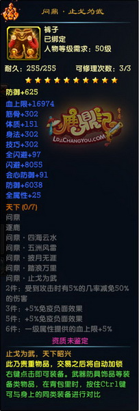 “得问鼎者得天下”,绝世问鼎系列神装第七件“问鼎·止戈为武”惊现江湖,上万血上限加成,从筋骨、体质到防御无一不包,更有全属性加成为你带来最全面的守护!超惊艳属性,10星完美品质,着此神装,问鼎武林将不再是梦想!